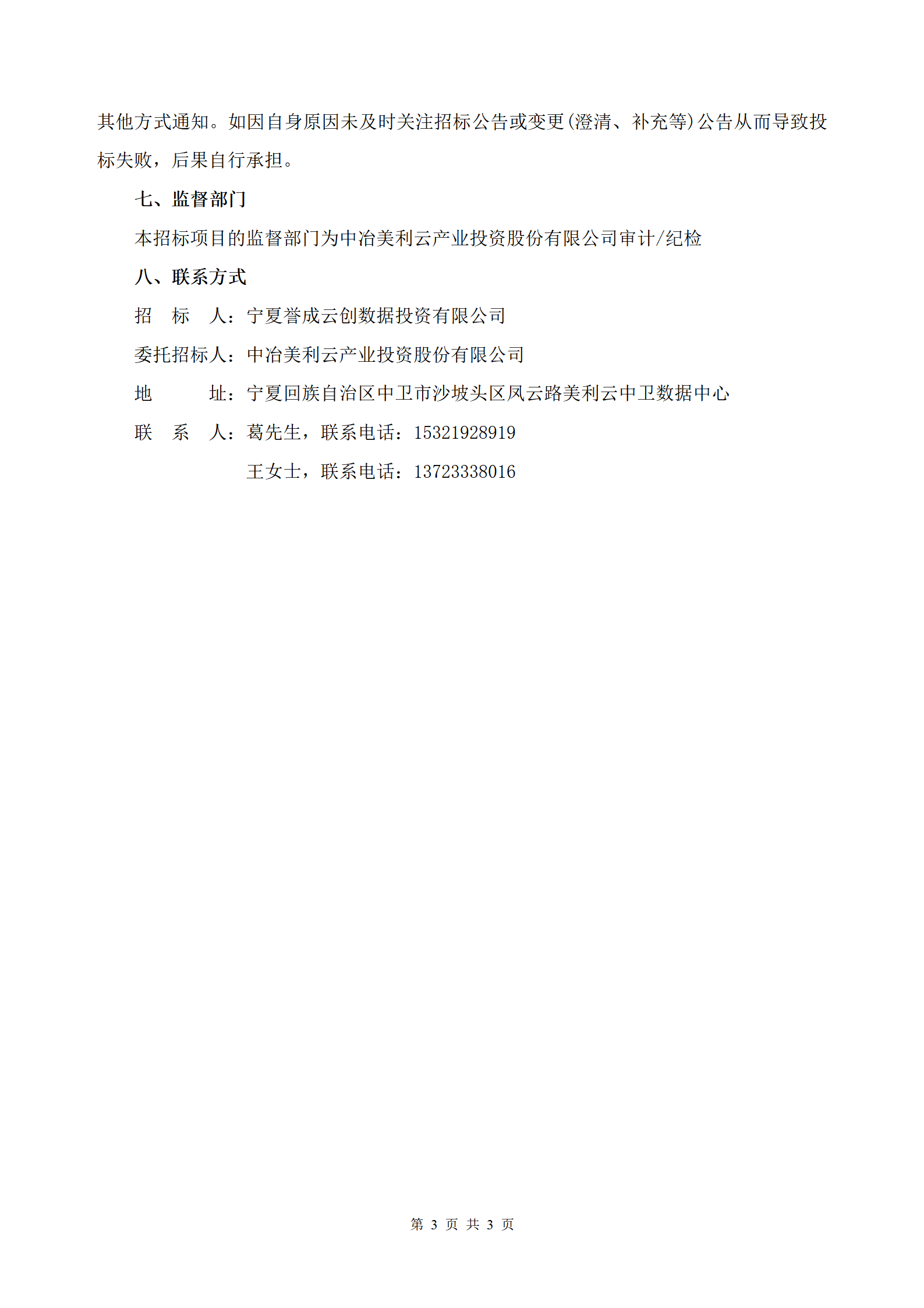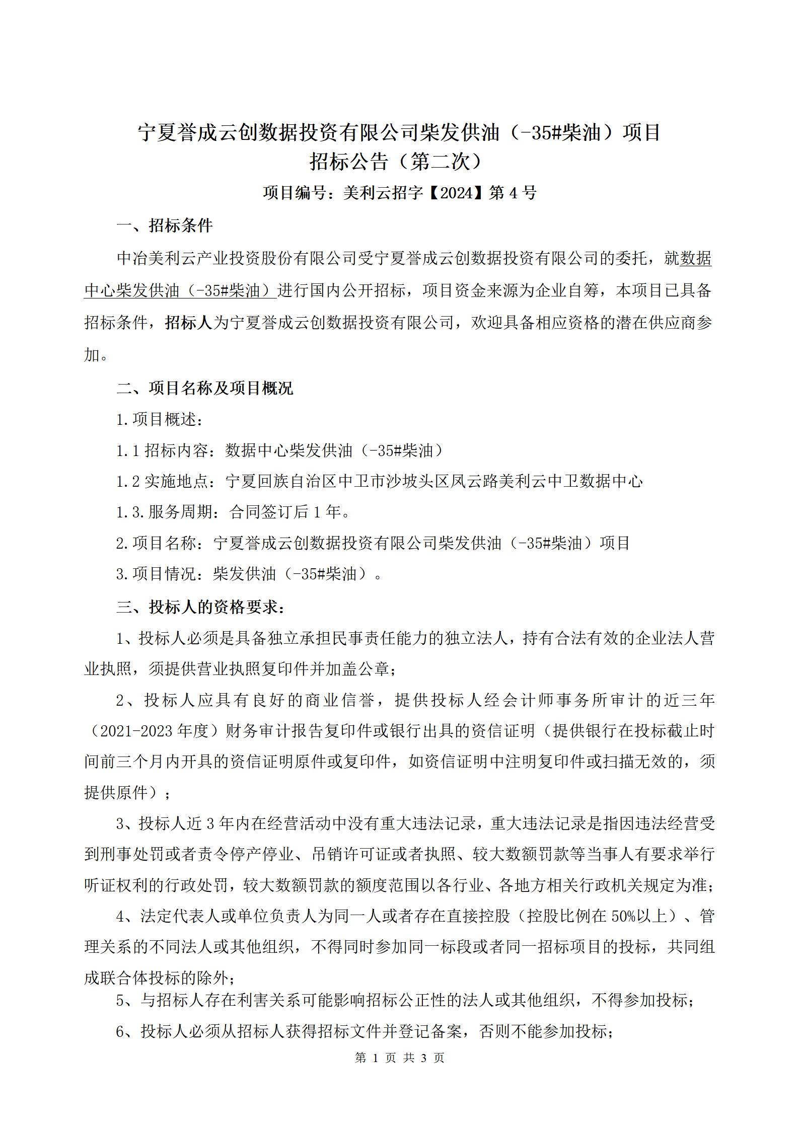 寧夏譽成云創數據投資有限公司柴發供油(-35#柴油)項目,招標人為寧夏譽成云創數據投資有限公司,委托招標人為中冶美利云產業投資股份有限公司。本項目于2024年9月30日至2024年10月13日報名獲取招標文件,2024年10月21日上午 9:30 分截止投標、開標,由于截止至開標時間,遞交投標文件的投標人不足三家,根據相關規定,本次公開招標流標。現招標文件二次確定招標時間與招標地點。現需在“美利云采購信息公眾號”與“美利云公司官網”發布招標公告(第二次)。