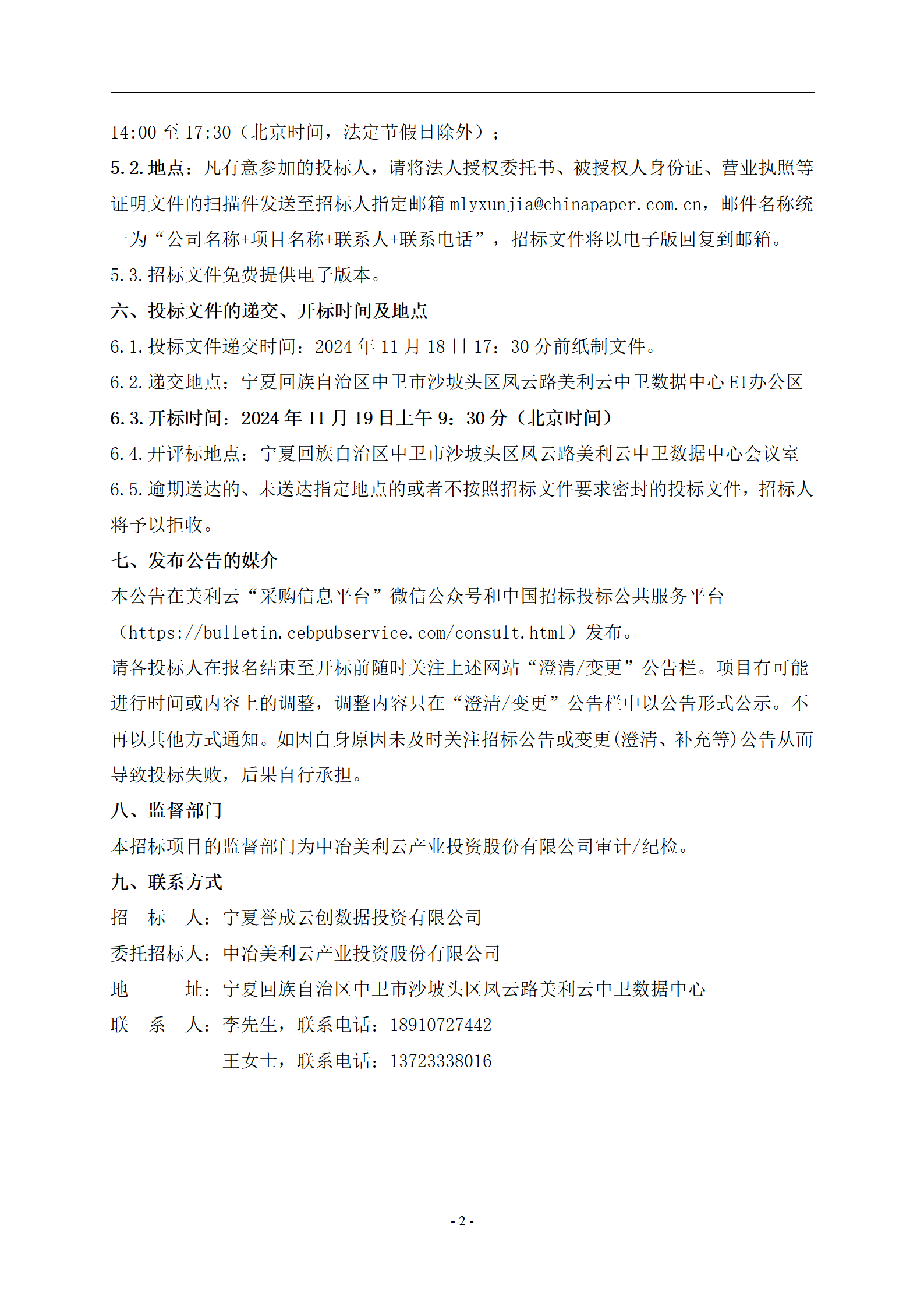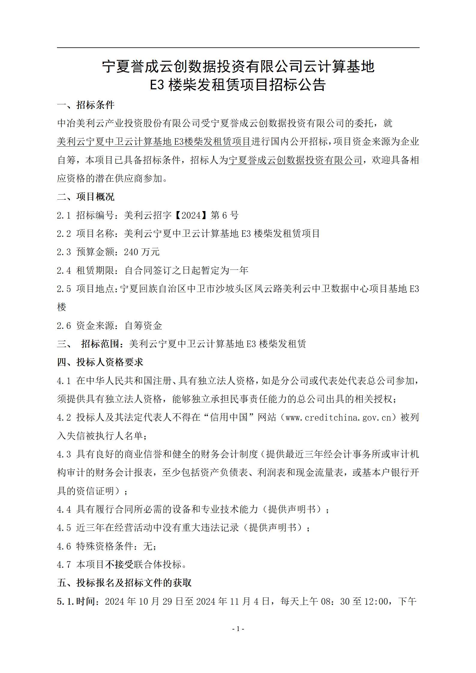 中冶美利云產業投資股份有限公司受寧夏譽成云創數據投資有限公司的委托,就美利云寧夏中衛云計算基地E3樓柴發租賃項目進行國內公開招標,項目資金來源為企業自籌,本項目已具備招標條件,招標人為寧夏譽成云創數據投資有限公司,歡迎具備相應資格的潛在供應商參加。